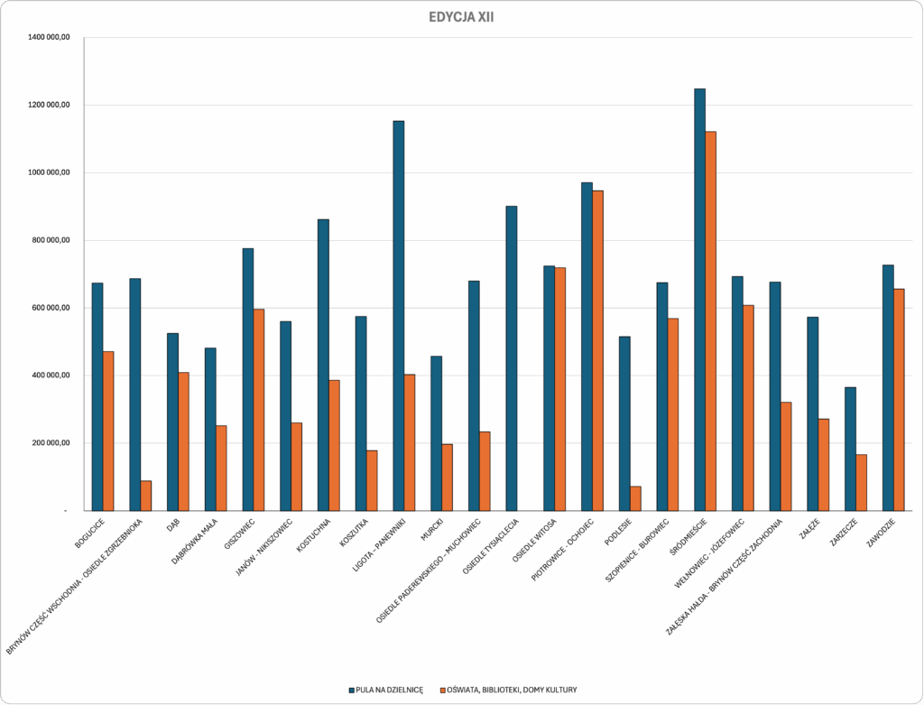 W ostatniej 12. edycji, oświata, biblioteki i domy kultury (bez ZZM i MOSIR, choć też złożyli swoje projekty) otrzymały aż 62% środków z pul lokalnych. Najwięcej, bo 58% zabrała z BO oświata. W 17 dzielnicach (na 22) wygrały projekty oświatowe.